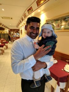 Babies create some of the most fun interactions! This evening we had dinner at a nice Indian restaurant. Theo was more interested in the happenings of the restaurant than dinner and spent most of the time facing backwards in his high chair. Our waiter loved Theo! He ask if he could hold Theo while we walked to the door! Never had that happen back home. 🙂
